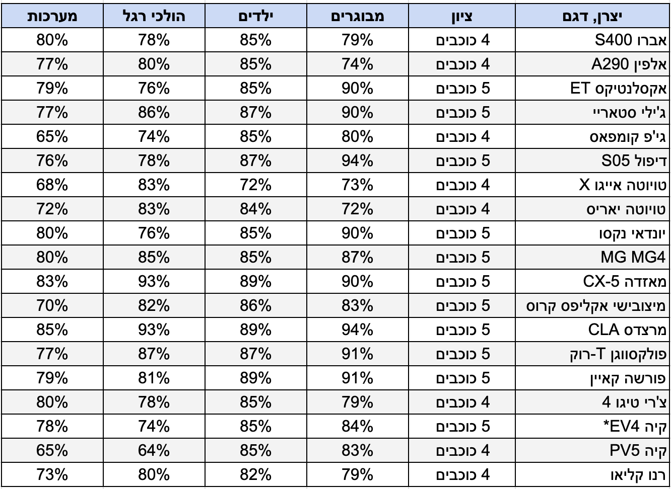 הערות. רשימת הדגמים לפי סדר הא"ב של המותגים שלהם; אלפין A290 ורנו 5 דגמים כמעט זהים, אלא שהתוצאות אינן בדיוק זהות; קיה EV4 קיבל 4 כוכבים עם מפרט הבטיחות הרגיל (67%) ו-5 כוכבים עם 'חבילת בטיחות' (78%).